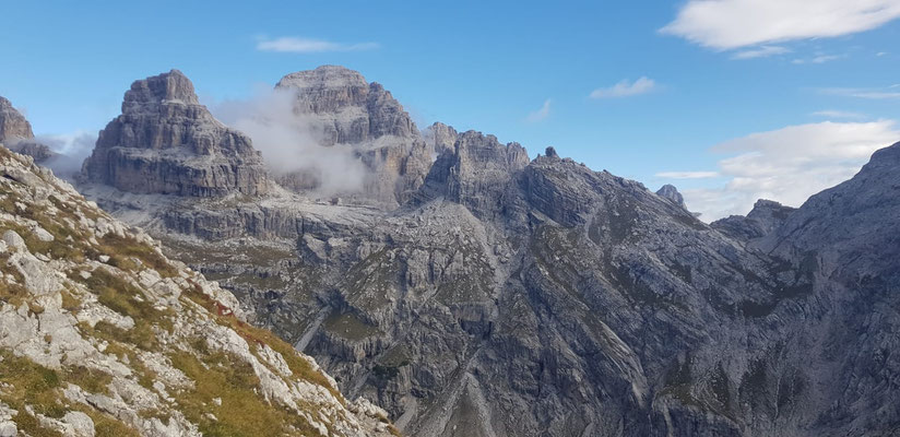 Ein Traumwandertag startet in leichtem Auf und Ab immer unter riesigen Felstürmen zum Rifugio Tuckett (2272m) und weiter über die Galleria Bogani (kurze Drahtseilversicherung, unschwierig) an eindrucksvollen Gipfeln wie „Crozzon di Brenta“ und „Cima Tosa“ vorbei zum Rifugio Brentei (2182m), mitten im Herz der Brenta Dolomiten. Nach der verdienten Mittagsrast geht es weiter durchs Val Brenta Alta und über eine kurze mit Stahlseilen gesicherten Passage zur Scharte „Bocca di Brenta“ (2252m). In wenigen Minuten hinab zur