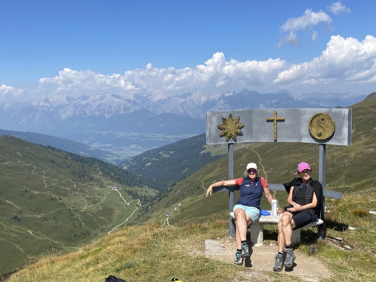 Los geht die Tour direkt in Hochfügen. Ein geschotterter Weg führt uns vorbei am Pfundsalm Niederleger hinauf zum Pfundsalm Hochleger. Der Forstweg geht dann bald in ein herrlich grünes und ausgesprochen idyllisches Almgebiet über. So schlängelt er sich langsam, aber sicher hinauf zum Gipfel (mit Friedenssymbol, das neun unterschiedliche Religionen präsentiert und vereint. Der „Phönix aus der Asche“, der mittendrin thront, symbolisiert die Wiedergeburt)