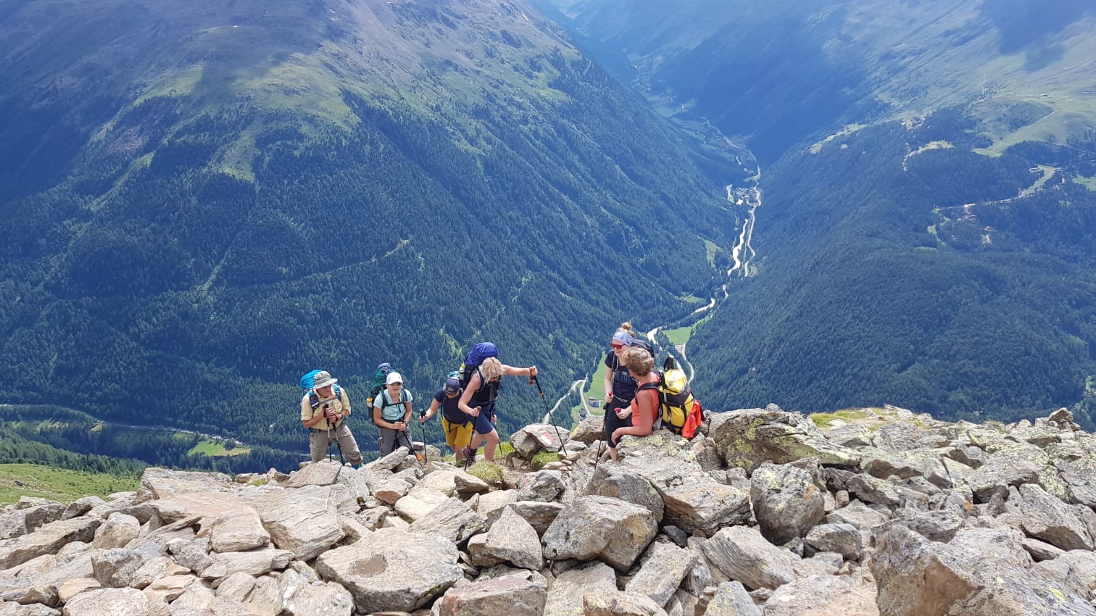 Ein Taxibus bringt uns auf 1.900 m zu einem Gasthaus, dann geht’s los zum Brunnenkogelhaus (2.735 m), wo uns eine wunderschöne 360° Panoramasicht erwartet. So toll sollte jede Bergwoche beginnen!
