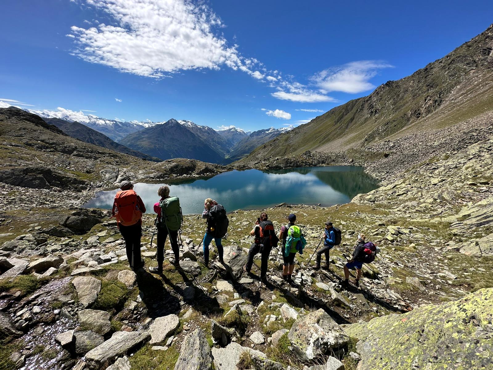 Ein gemütlicher Abstiegsweg führt zur Kleble Alm auf 1.985m. Wir beenden unsere beeindruckende Bergwanderwoche und kehren per Taxibus nach Sölden zurück.