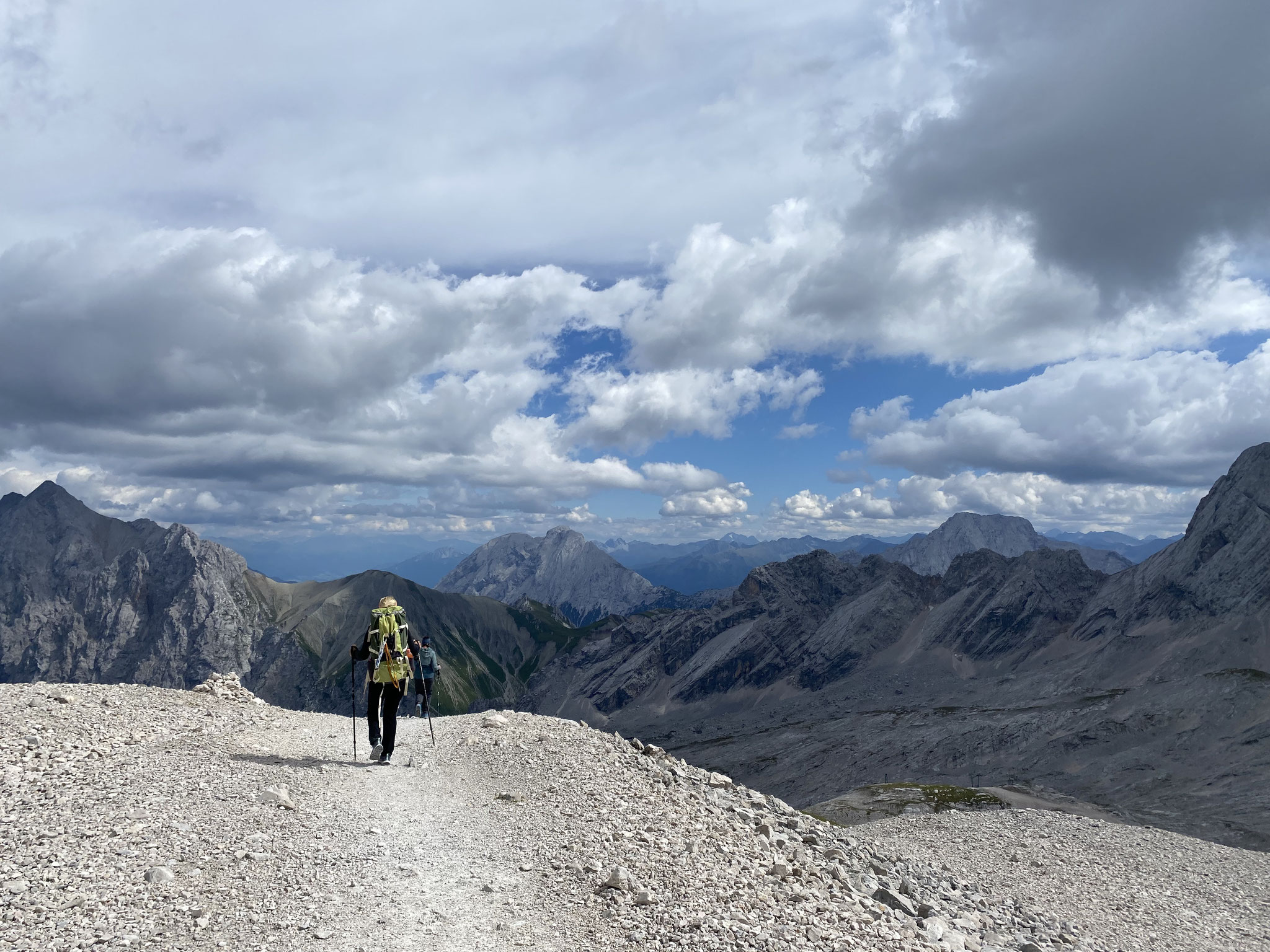 Nach einem reichlichen Frühstück machen wir uns früh auf den Weg Richtung Zugspitzgipfel. Nach einer guten Viertelstunde erreichen wir den Talschluss und wandern nun bergan bis wir nach zwei Stunden bei der Knorrhütte angekommen sind. Dort können wir uns mit einem zweiten Frühstück stärken, bevor wir in stetigem Auf und Ab über das